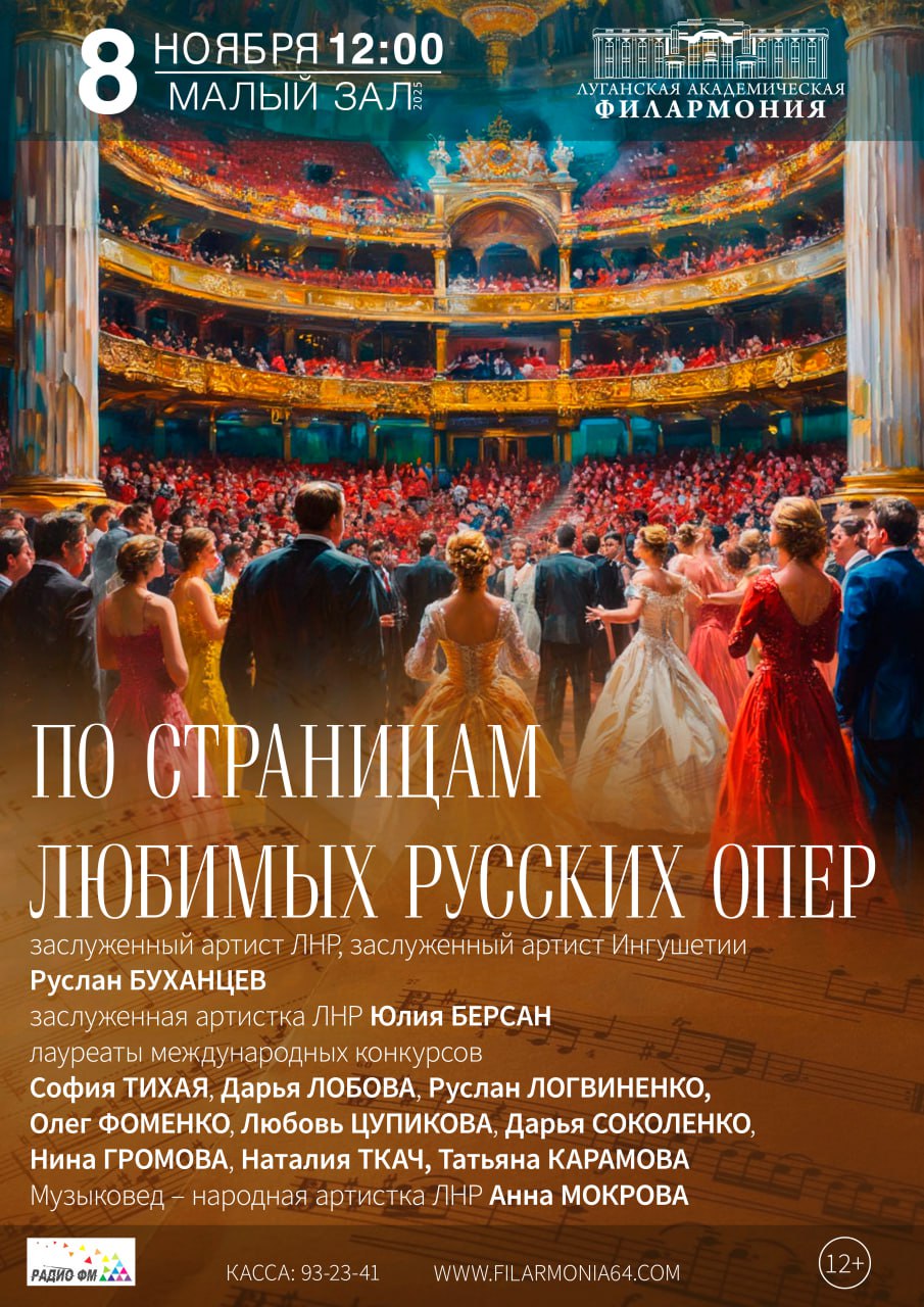 Арии и ансамбли великих русских композиторов из наиболее известных оперных спектаклей прозвучат в исполнении ведущих солистов филармонии. Перед зрителями предстанет целая галерея интересных образов: кроткая Марфа из «Царской невесты» Н.А. Римского-Корсакова и Снегурочка из его одноименной оперы; Татьяна, Лиза, Гремин из «Пиковой дамы» П.И. Чайковского; Алеко и Земфира С. Рахманинова, Оксана и Параска из «Ночи перед Рождеством» и «Сорочинской ярмарки» из опер по произведениям Н.В. Гоголя, и многие другие герои и героини любимых русских опер.