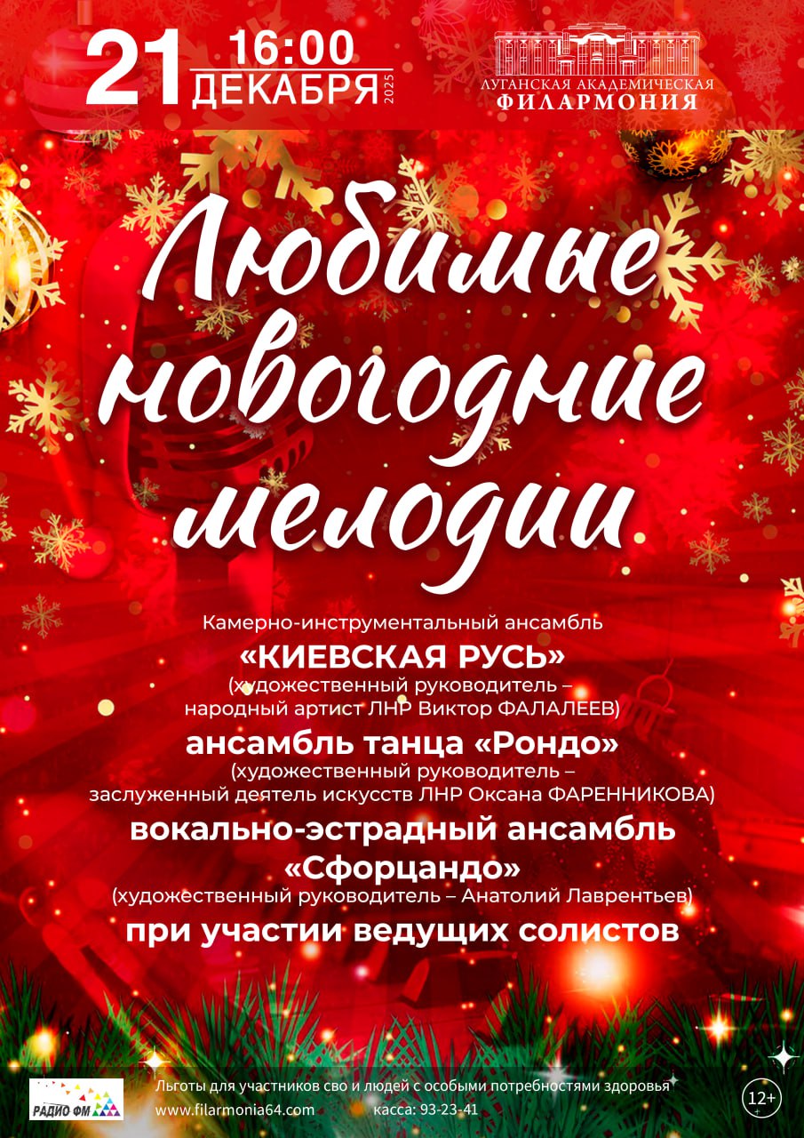 Дорогие друзья, приближается самый сказочный праздник года, и мы рады пригласить вас на особенное событие – концерт «Любимые новогодние мелодии»! В этот вечер вас ждет настоящее погружение в атмосферу праздника, созданное талантливыми артистами Луганской академической филармонии. В программе концерта – только самые любимые и узнаваемые композиции, которые мгновенно переносят нас в атмосферу детства и волшебства.