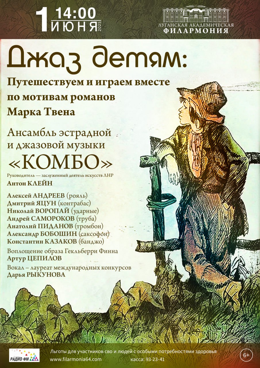 Новый концерт из цикла о литературных героях познакомит вас с этим ярким парнем. Свободолюбивый и независимый Гекльберри расскажет о том, как жить и путешествовать по Новому Орлеану, родине джаза. Надежный, добрый и искренний парнишка – ему все по плечу! Он устроит интерактивные игры прямо со сцены, остановит коварных разбойников и, конечно, найдет много новых друзей. А может, и старые друзья где-то рядом?..