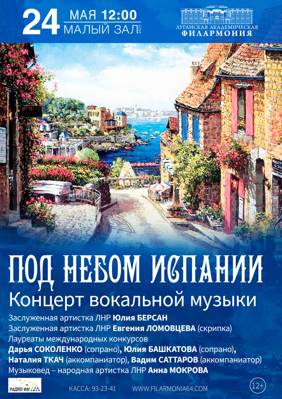 Цикл песен Ф. Обрадорса «Испанские народные песни» и Х. Нина «Испанские классические песни» еще больше погружают нас в мир испанской культуры. В песнях звучит юмор, лирика, пылкая страстность, здесь присутствуют образы природы, образы материнской любви, и все это великолепие захватывает слушателя буйством ритмов и красок, потоком ярких и своеобразных мелодий. И, конечно, будет представлено детище Испании – сарсуэла, национальная разновидность театральной музыки, близкая оперетте. Арии из известных сарсуэл М. де Фалья и Р. Чапи покорят сердца слушателей огненным темпераментом и целой россыпью незабываемых испанских мелодий.