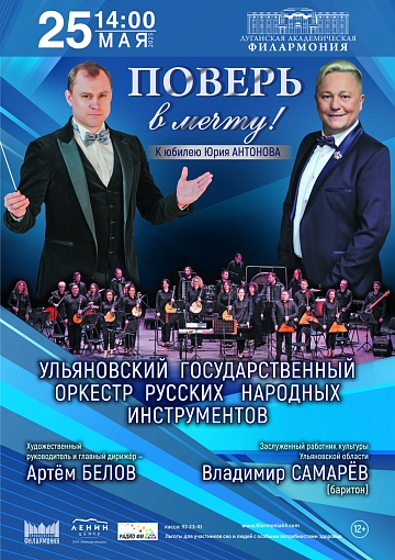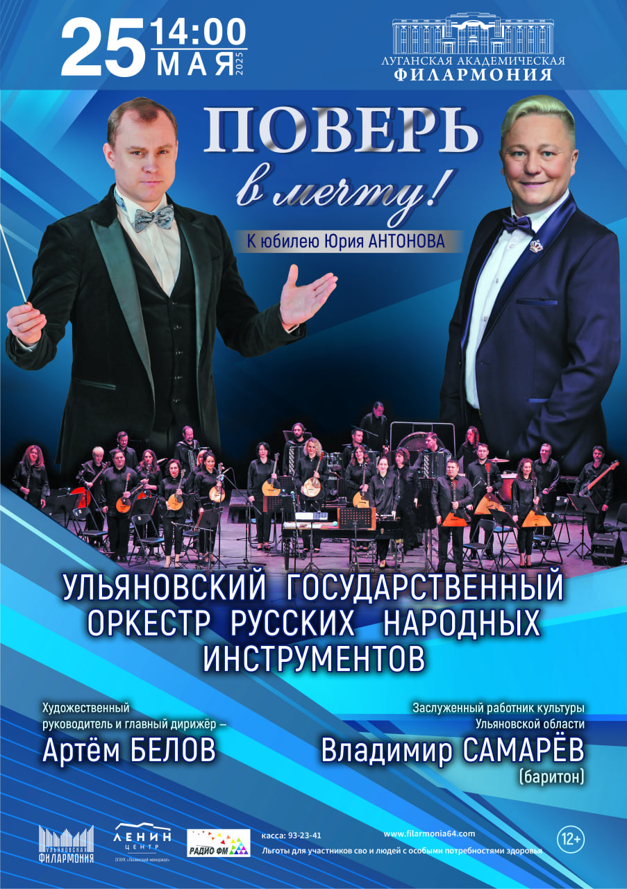 В 2025 году Юрий Антонов отметил 80-летний юбилей. Этой дате посвящён концерт, в котором солист Ульяновской филармонии Владимир Самарёв в сопровождении Русского оркестра под управлением Артема Белова исполнит лучшие и любимые песни из репертуара певца. Это будет настоящий праздник, который наполнит каждое сердце счастьем, вдохновением и любовью!