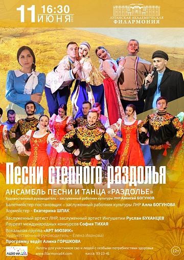 Безмерно красива и многогранна народная культура. Концертная программа ансамбля песни и танца «Раздолье» представит зрителю народные песни и танцы, в которых бережно и нежно передается вся сокровенная душевная красота России. Так же прозвучат веселые, плясовые и шуточные композиции. Русская песня – это живое творчество русского народа и, покуда она будет жить, будет жить и наша русская культура.