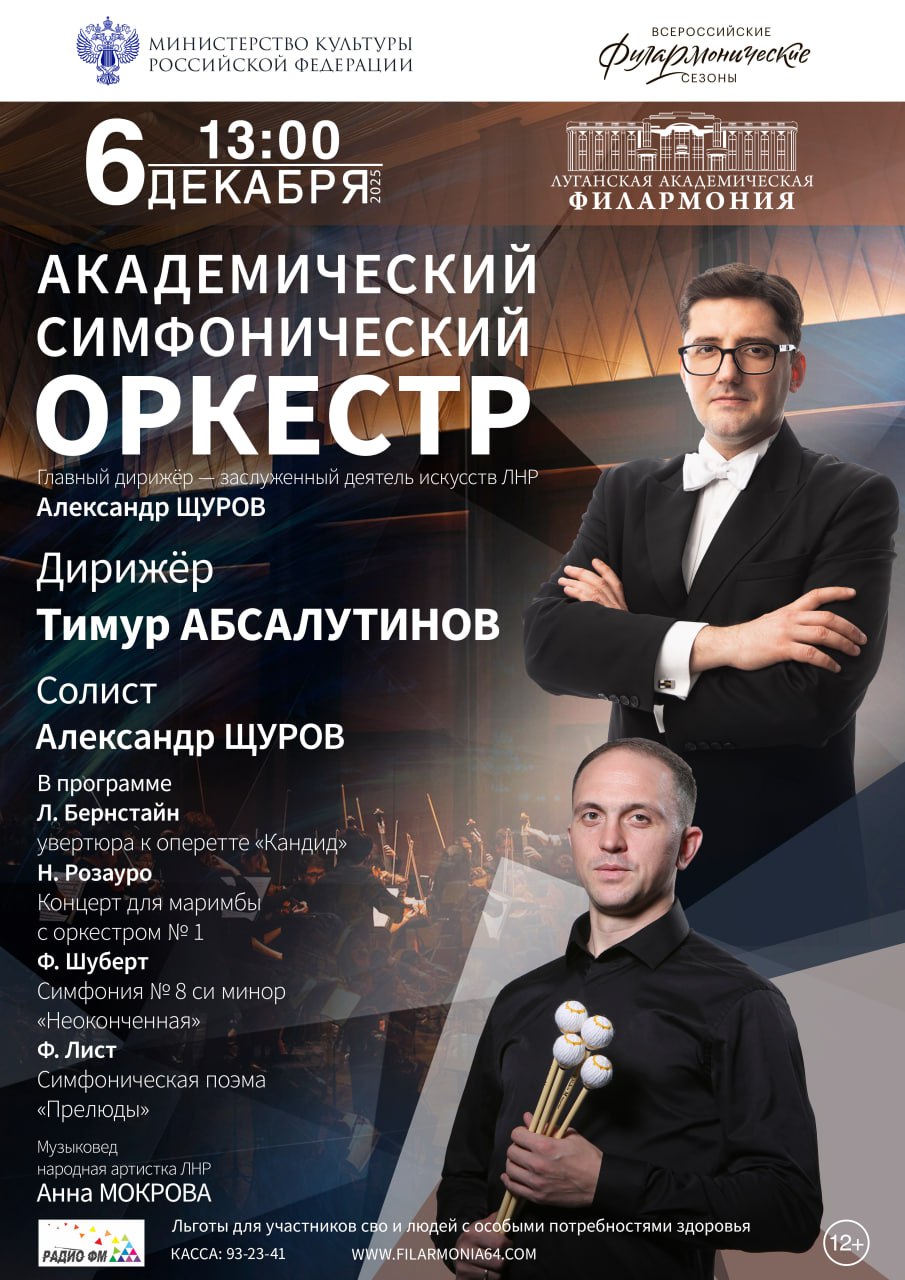 Академический симфонический оркестр под управлением заслуженного деятеля искусств ЛНР Александра Щурова исполнит программу совместно с дирижёром Тимуром Абсалутиновым (Воронеж) в рамках программы Министерства культуры РФ «Всероссийские филармонические сезоны». Концерт классической музыки откроет завораживающая увертюра к опере «Кандид» Леонарда Бернстайна. За ней последует «Концерт для маримбы с оркестром №1» Ней Розауро, демонстрирующий виртуозность исполнителя и богатство тембра экзотического инструмента. Следом слушателей ждет погружение в глубины человеческих чувств с бессмертной Симфонией №8 си минор «Неоконченная» Франца Шуберта. Завершит программу масштабная и драматичная Симфоническая поэма «Прелюды» Ференца Листа, повествующая о перипетиях человеческой жизни.