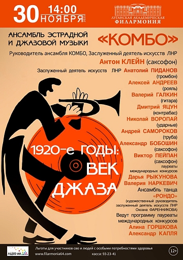 Забудьте о серых буднях! Сегодня зрителей ждет мир, где каждый день – праздник, а каждая встреча – танцы до утра! Это – «20-Е ГОДЫ: ВЕК ДЖАЗА»! Эпоха, когда слово «джаз» означало настоящую страсть, стиль танца и музыку, которая заставляет душу петь! Артисты собрали для слушателей лучшие мелодии двадцатых годов – мелодии, полные жизни, иронии и безграничной свободы. Время, когда музыка стала легендой! На сцене зажигательные ритмы величайших джазовых музыкантов: Рэя Хендерсона, Тайни Парэма, Портера Грейнджера и Эверета Роббинса, Бада Купера, Чарли Дэвиса, Самуэль Степта и Бада Грина.