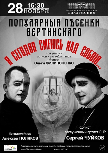 Сольный концерт заслуженного артиста ЛНР Сергея Чуйкова, который представит программу, посвященную творчеству великого шансонье. На сцену вместе с Сергеем Чуйковым выйдут талантливые артисты: концертмейстер Алексей Поляков и артистка ансамбля танца «Рондо» Ольга Филипоненко.