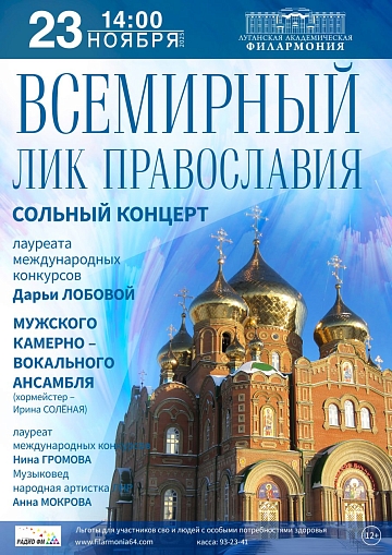 Сольный концерт лауреата международных конкурсов Дарьи Лобовой совместно с мужским камерно-вокальным ансамблем (хормейстер Ирина Соленая) – «Всемирный лик Православия». Сочетание проникновенного сольного исполнения и мощного ансамблевого звучания создаст поистине многогранную и эмоционально насыщенную атмосферу.
