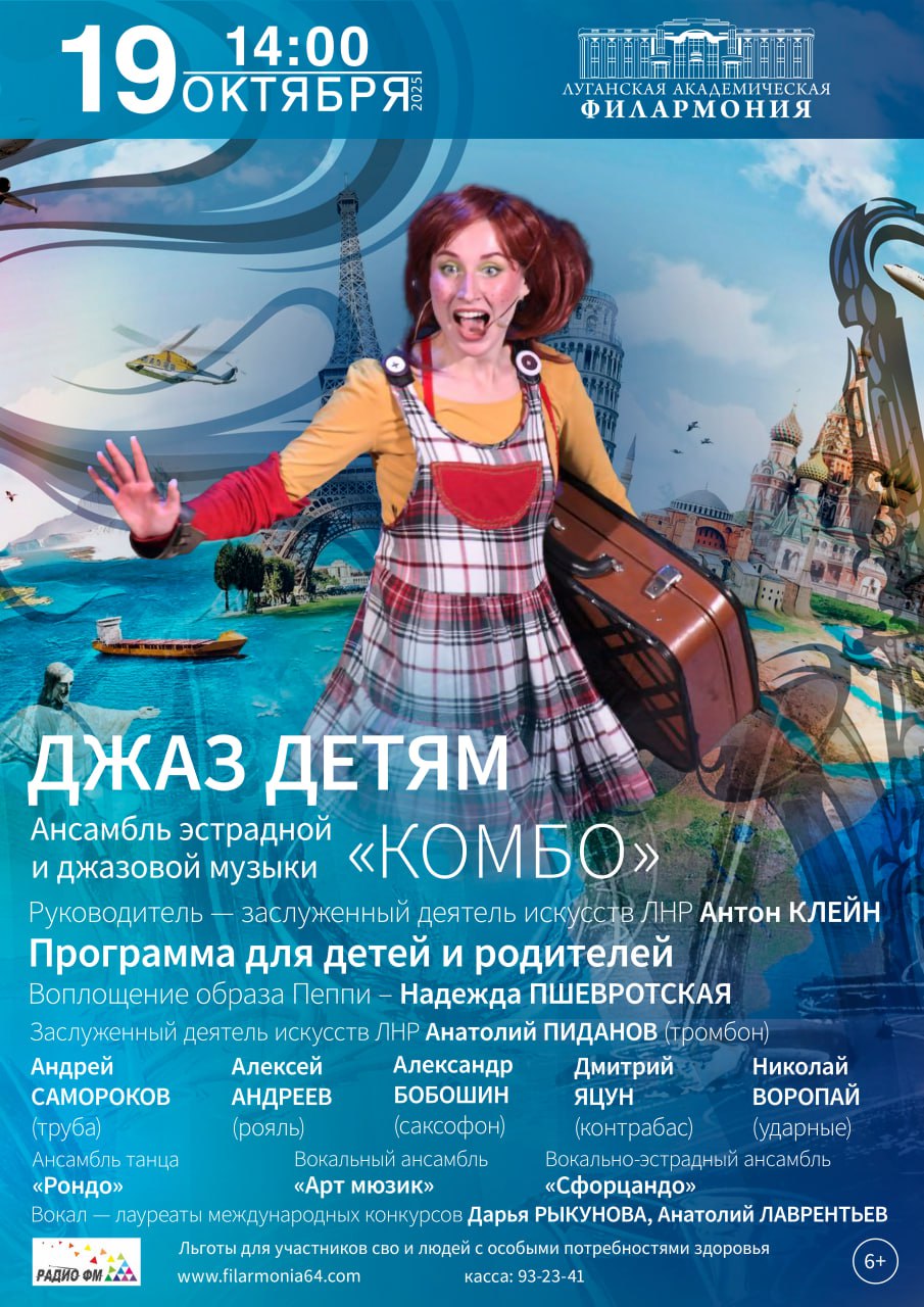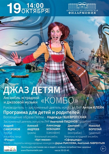Программа «Джаз детям» с самой необыкновенной девочкой в мире - Пеппи Длинныйчулок, обладающей небывалой силой, при этом очень доброй, заботливой, которая каждый новый день не перестает удивлять своими выдумками. Легко заводит себе новых друзей, находит различные приключения и с легкостью находит выход из любой ситуации. Даже музыка вступает с ней в сговор. Джазовая музыка в которой главная роль принадлежит ритму и импровизации, как бы иногда соперничает с главной героиней, предлагая юным зрителям быть внимательными, креативными, вырабатывать командный дух ,участвовать в интересных интерактивах.