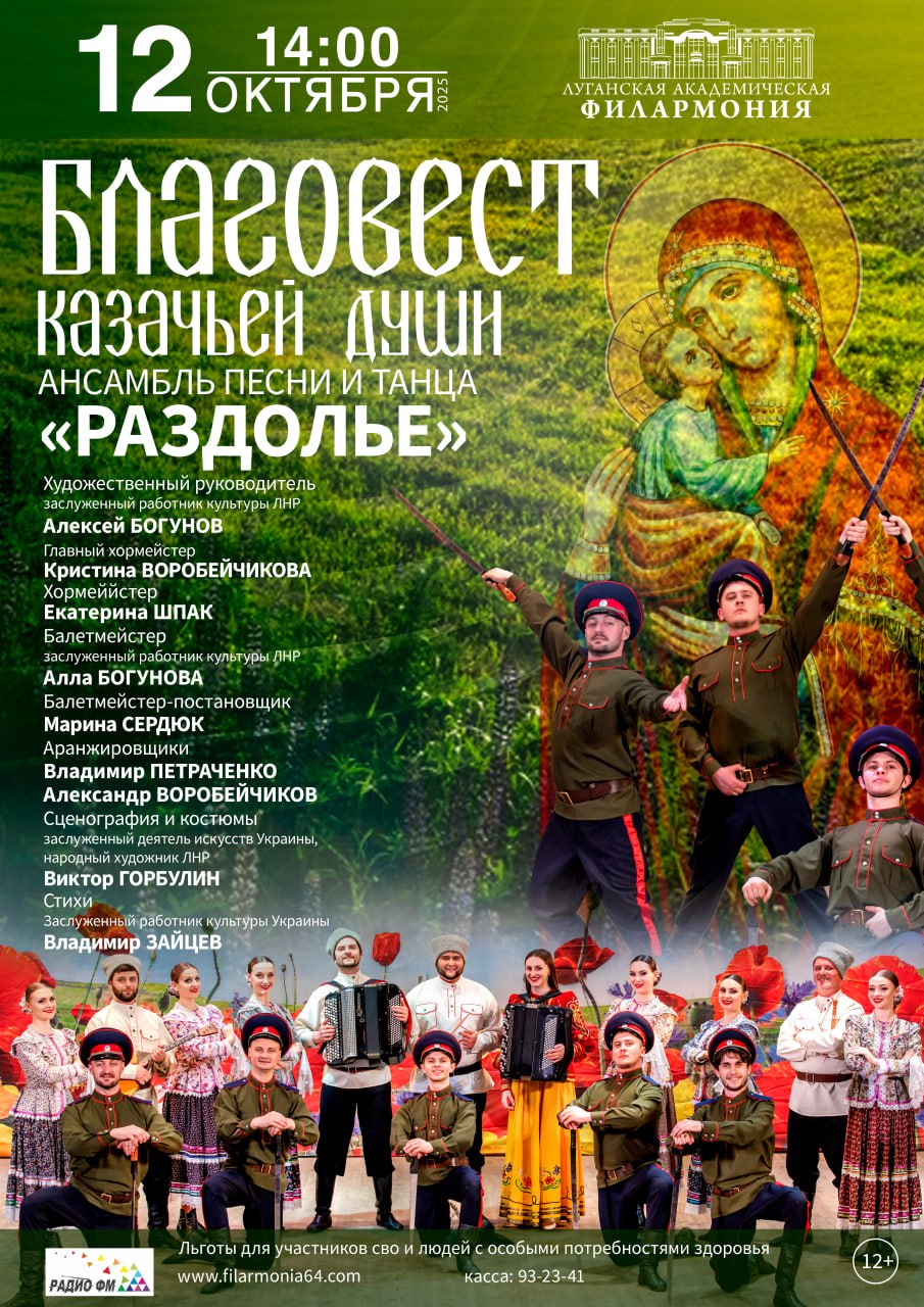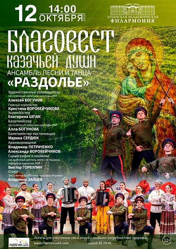 12 октября в 14:00 ансамбль песни и танца «Раздолье» под руководством заслуженного работника культуры ЛНР Алексея Богунова представит зрителям Луганской академической филармонии театрализованную постановку «Благовест казачьей души».