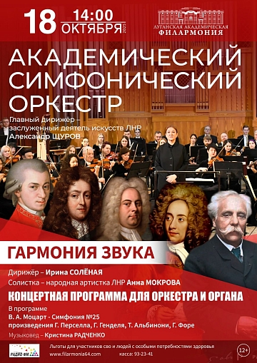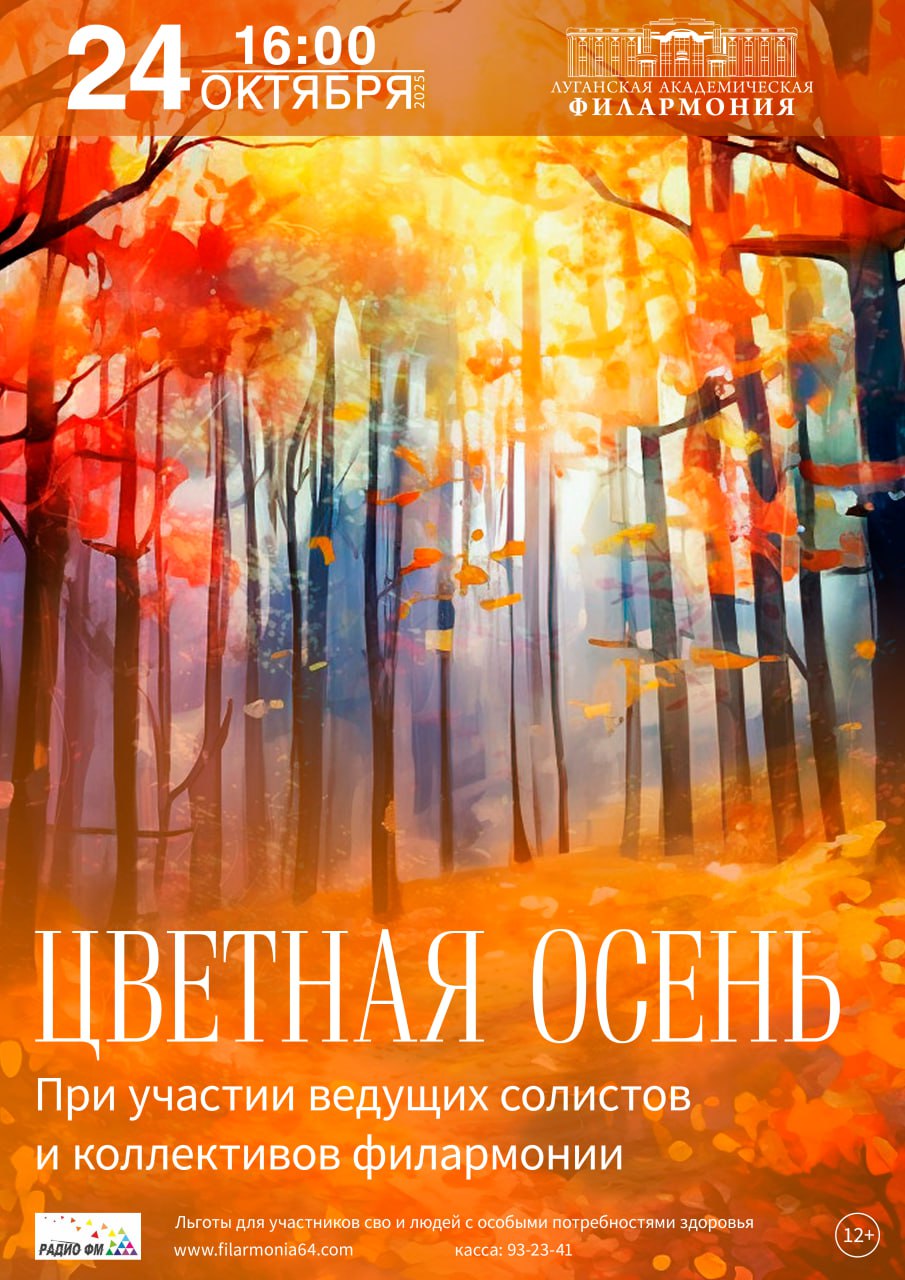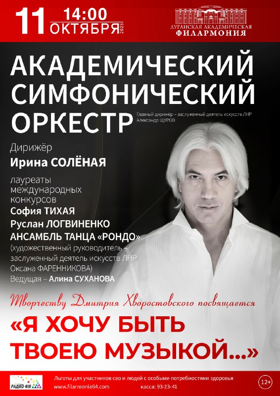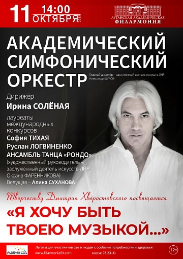 11 октября в 14:00 академический симфонический оркестр Луганской академической филармонии (дирижер Ирина Соленая) представит программу «Я хочу быть твоей музыкой» при участии лауреатов международных конкурсов Софии Тихой, Руслана Логвиненко, ансамбля танца «Рондо» под руководством заслуженного деятеля искусств ЛНР Оксаны Фаренниковой. Программа посвящена памяти известного оперного певца Дмитрия Хворостовского.
