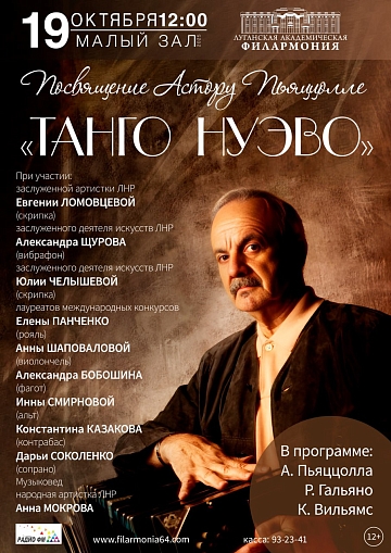 Танго — это танец, который покорил весь мир, и стал национальным достоянием Аргентины. Можно только представить, какие трудности преодолел А. Пьяццолла, чтобы реформировать этот жанр. И его Новое танго вывело танго за рамки прикладной музыки, превратило его в яркий концертный жанр, наполненный глубоким содержанием и виртуозным блеском. В программе – танго-композиции А. Пьяццоллы, Р. Гальяно, Дж. Вильямса. Звучащие мелодии и завораживающие ритмы пронесут через мир страсти и эмоций, создавая незабываемую атмосферу для всех присутствующих.