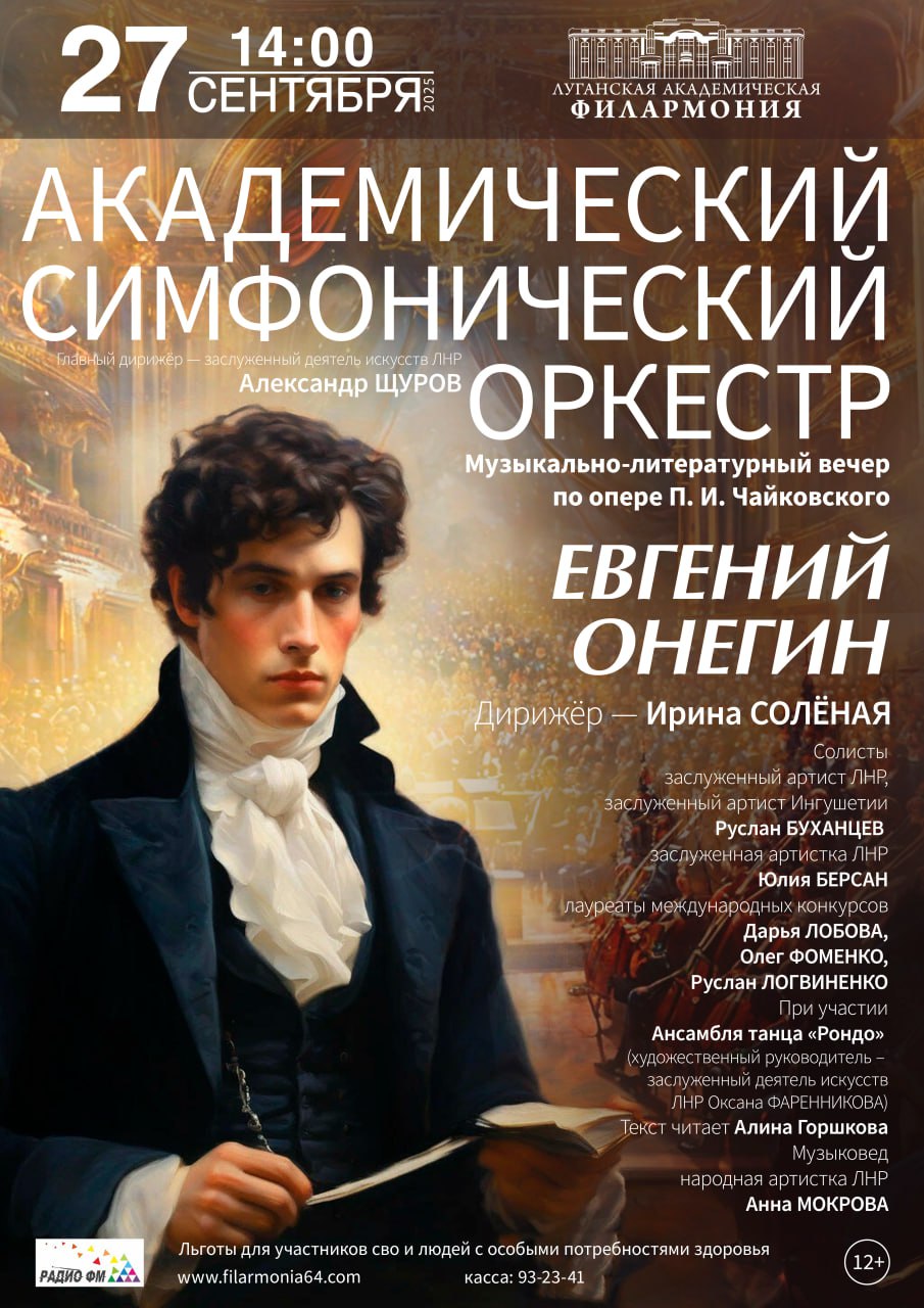 Представляем зрителю силу и нежность пушкинского слова, соединив его звучание с великой музыкой Петра Ильича Чайковского. На сцене будут представлены известные номера из оперы «Евгений Онегин» в исполнении ведущих солистов филармонии и ансамбля танца «Рондо».