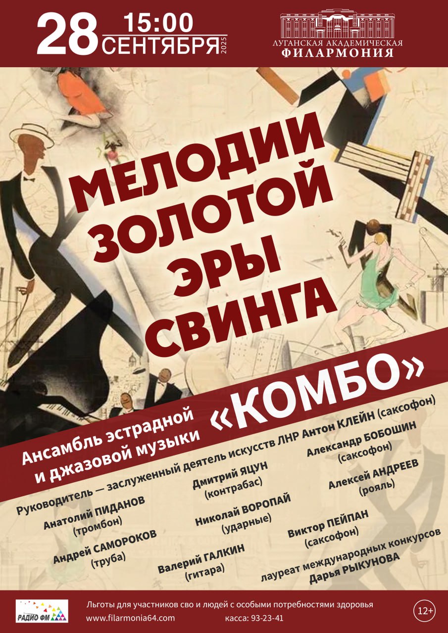 Ансамбль эстрадной и джазовой музыки «КОМБО» распахивает двери в чарующий мир «золотой эры свинга», предлагая вам совершить незабываемое путешествие во времени, в самое сердце 30-х годов XX века. Именно в эти годы, когда Америка переживала тяжелейший экономический кризис, джаз впервые в своей истории стал самым популярным музыкальным направлением в стране. Свинг гремел из каждого радиоприемника и музыкального автомата, покоряя сердца и даря надежду.