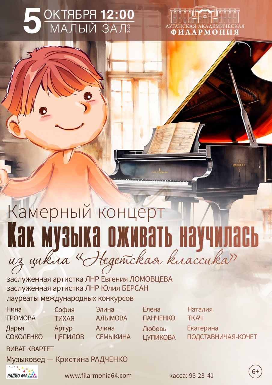 Музыка – один из древнейших видов искусства. Подобно живописи, театру, поэзии она является образным отражением мира. С первых минут жизни человека она входит в его дом с колыбельной песней матери, звучит на улице, в школе и дома. Через музыку композитор выражает чувства, настроения, мысли, изображает различные картины, движения, к примеру, шаг, наклон, рисует портреты. Изобразительные детали могут существенно дополнить музыку, сделать её более яркой, доступной и понятной. На нашей концертной программе мы предлагаем разобраться, как музыка научилась оживать. А помогут в этом ведущие артисты филармонии.