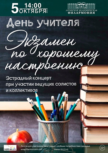 Дорогие зрители, приглашаем вас на эстрадный концерт «Экзамен по хорошему настроению», который пройдёт в День учителя. Забудьте о строгих оценках — мы проведём урок с улыбкой и в мажорном настроении!