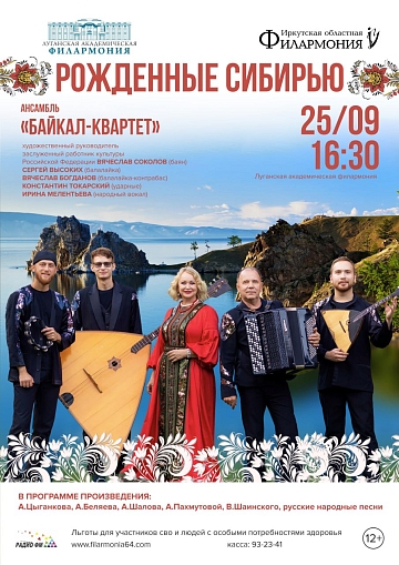 «Байкал-квартет» – яркий самобытный ансамбль, который по праву считается визитной карточкой Сибири, представляя Иркутскую область на различных международных мероприятиях. Музыкантам подвластна любая музыка – от классики до джаза, и они со всей широтой своей души делятся своим творчеством со зрителями Иркутской области. В концертной программе «Рожденные Сибирью» представлена широкая палитра музыкальных жанров русской музыки, а также оригинальные обработки в стиле «Музыкальный кроссовер». Прозвучат культовые инструментальные композиции – «Калинка», «Яблочко», «Барыня», «Валенки». Солистка ансамбля Ирина Мелентьева исполнит любимые песни – «Одинокая гармонь» Б. Мокроусова, «Шел казак на побывку домой» М. Фрадкина, «Выйду ночью в поле с конем» А. Шаганова, «Я лечу над Россией» Г. Пономаренко и другие. Здесь каждый слушатель услышит то, что близко его душе, что вызовет самые теплые чувства гордости за свою Родину.