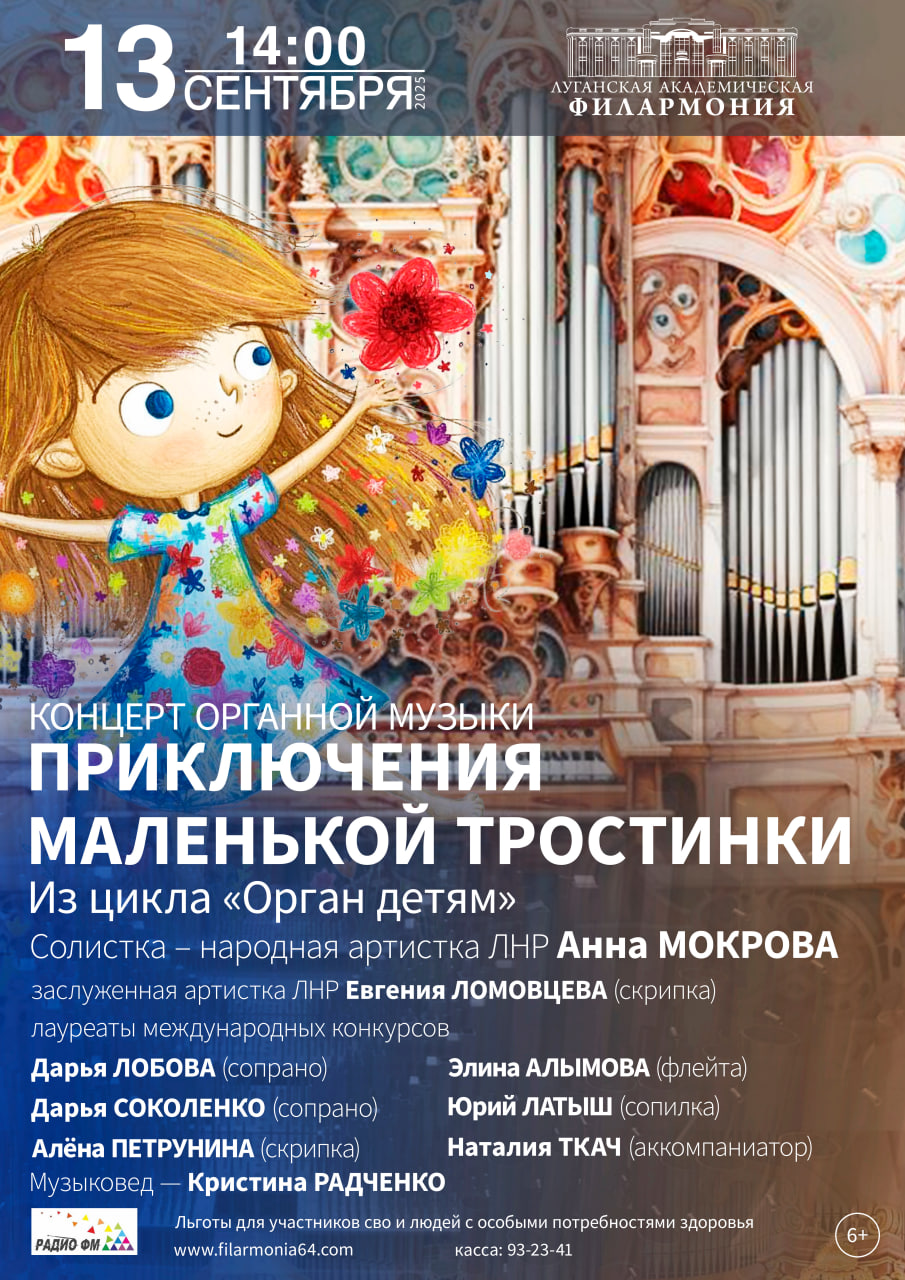 Концертная программа для детей и родителей «Приключения маленькой тростинки» – это удивительная история о том, как возник орган, о прабабушках и прадедушках органа – флейте Пана и волынке. Вы узнаете, как самый обыкновенный тростник превратился в настоящего Короля музыки. Ведущие артисты филармонии исполнят шедевры мировой классики – произведения Глюка, Глинки, Дюбуа, Боэльмана, Баха, Прокофьева и др. Настоящим сюрпризом для маленьких зрителей станет знакомство со старинными танцами.