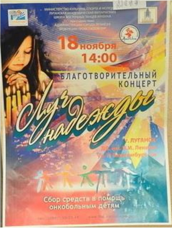 Цель акции – сбор средств для помощи онкобольным детям, находящимся на лечении в онкогематологическом отделении Луганской республиканской детской клинической больницы. Инициатором ее проведения выступили артисты Луганской академической филармонии, которые постоянно участвуют в благотворительных мероприятиях, доказывая, что культура и искусство не только исцеляют души, но и помогают материально.